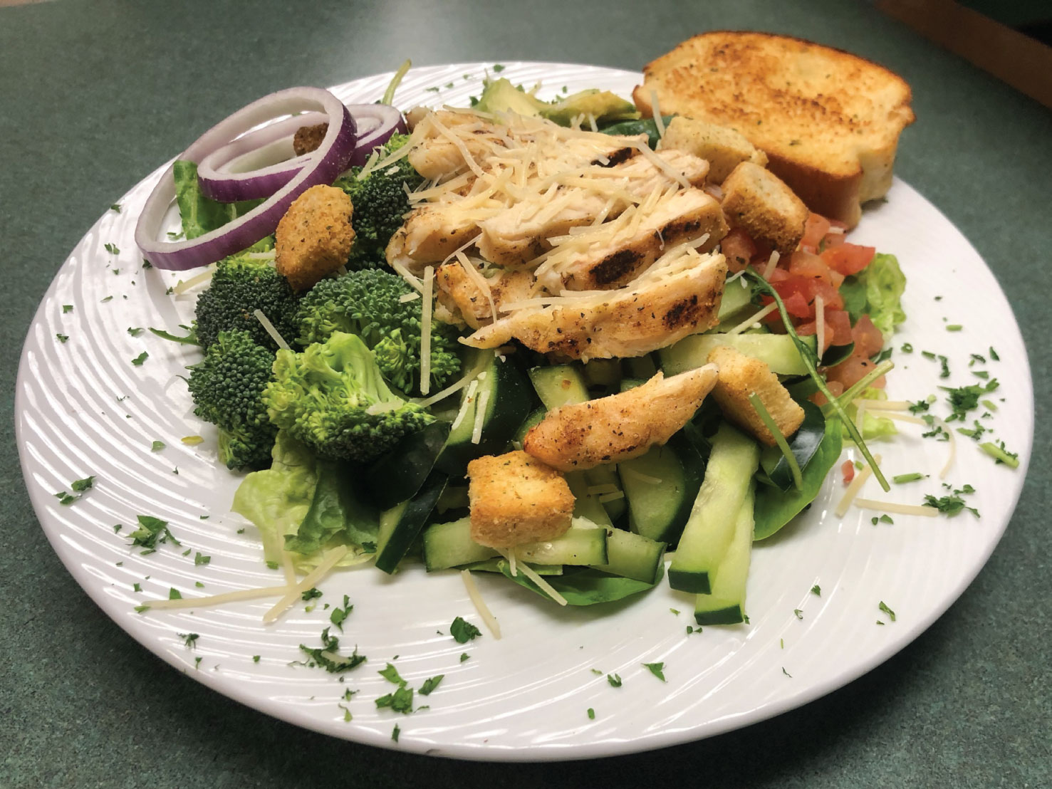 a beautiful salad mixture of crisp garden greens topped with red onion, tomatoes, cucumber, cheddar cheese & garlic parmesan croutons.