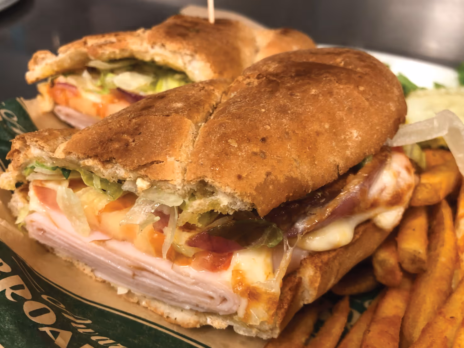 oven roasted turkey breast with tomatoes, lettuce, onion, special sauce & melted mozzarella.