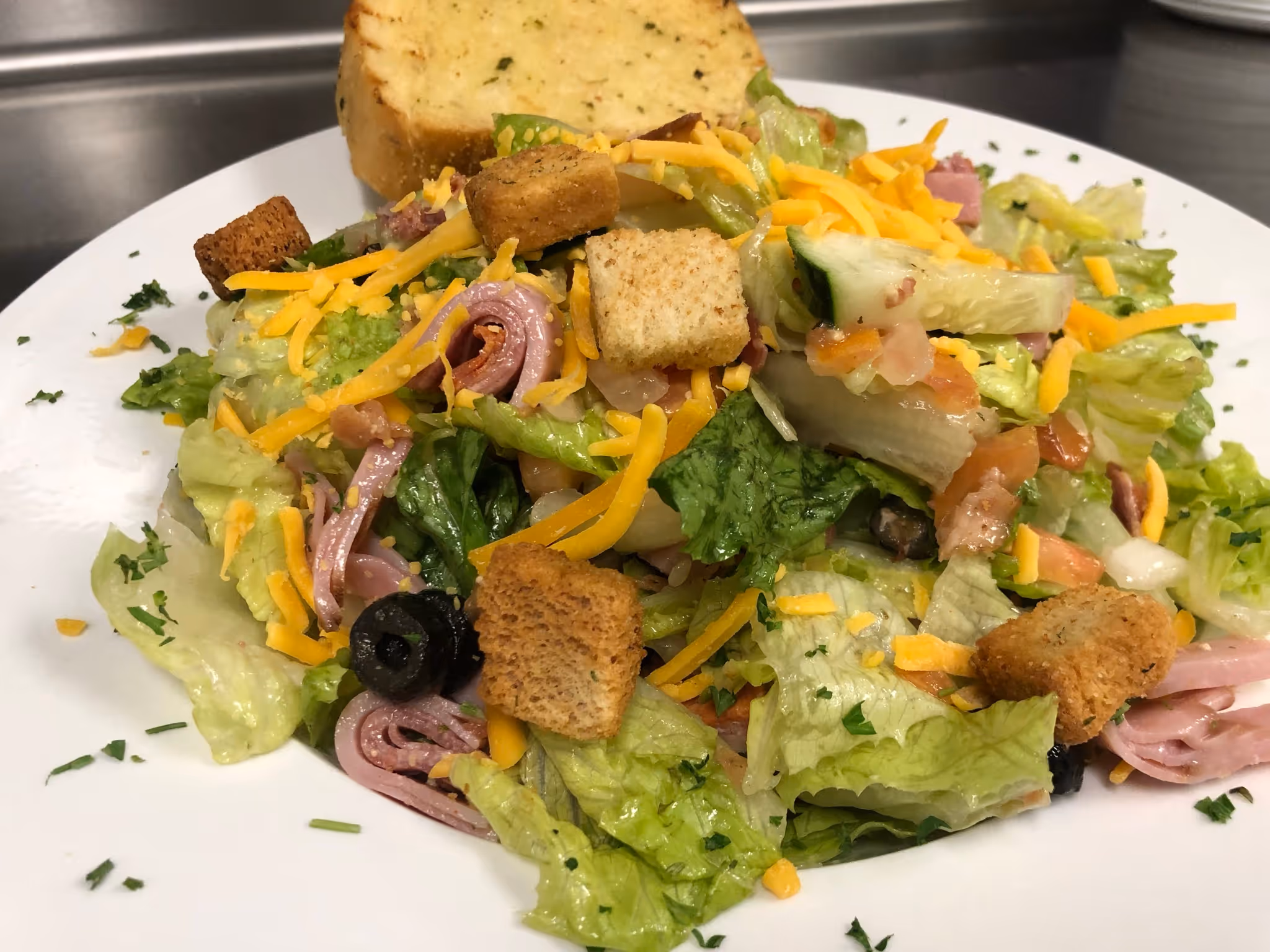 crisp signature greens tossed with italian herb dressing, ham, salami, pepperoni, bacon, seasoned tomatoes, onion, black olives, cucmber & garlic parmesan croutons. topped with cheddar cheese.