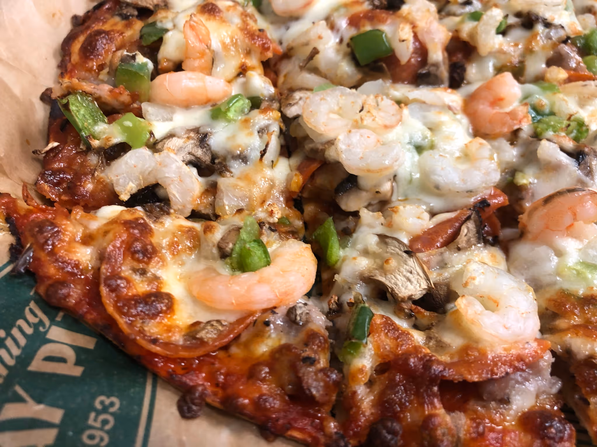 a favorite twist to our classic. a touch of shrimp plus cheese, sausage, pepperoni, mushrooms, green pepper & onion.